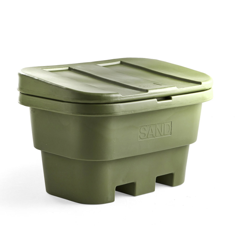 Lådan är tillverkad i återvinningsbar polyeten vilket gör den både miljövänlig och hållbar. Polyeten är ett slitstarkt material och håller därför länge. Den smarta konstruktionen gör att locket minimerar risken för kondens vilket sedan lätt leder till isbildning av innehållet. Gångjärnen är integrerade i konstruktionens baksida vilket gör att beslagen inte rostar. Sandlådan har ”SAND” ingjutet i lådans front, vilket gör att det inte slits bort. Lådan passar perfekt på parkeringar, vid gångbanor och järnvägsstationer.