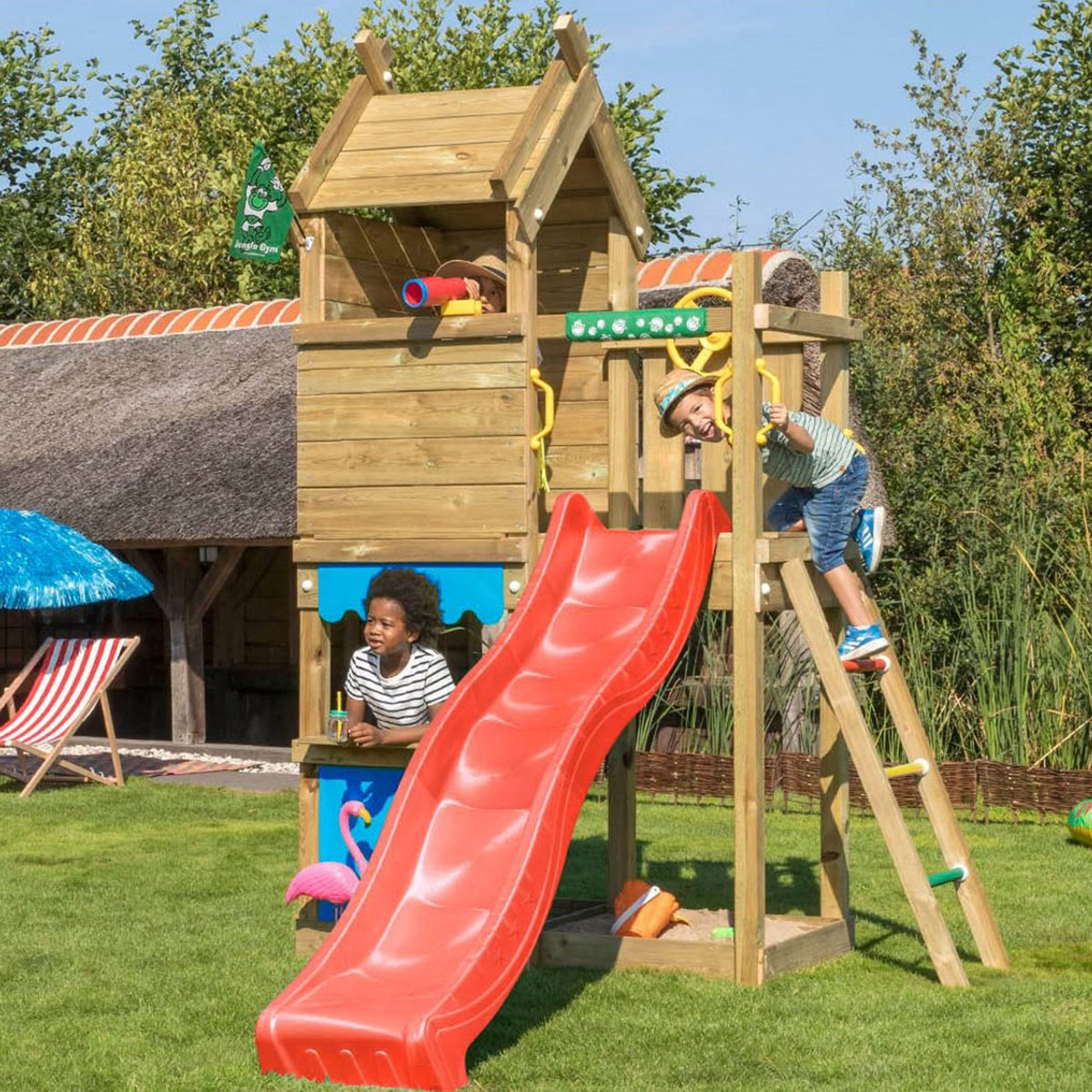 Aloha! The Jungle Resort är en högpresterande kombination av modern design med en inbjudande semesterstil. Koppla av i klätterställningens sandlåda, unna dig minimarknaden, umgås med dina nära och kära på lekplatsen, eller för lite mer spänning kan de små semesterfirarna glida ner för rutschkanan. Kompatibel med 2-gungsmodul 200, 2-klättringsmodul 200, brandmansstång från Jungle Gym.