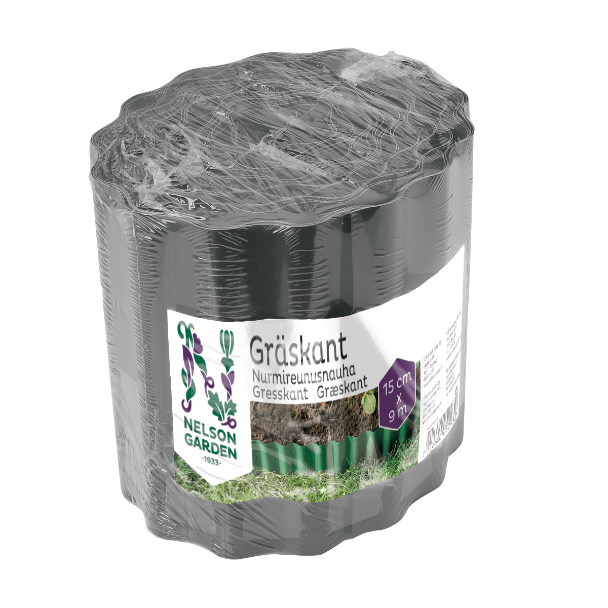 Gräskant från Nelson Garden i plast som placeras t.ex. mellan gräsmatta och rabatt så att gräset inte sprider sig in i rabatten. Använd till både raka och rundade former.