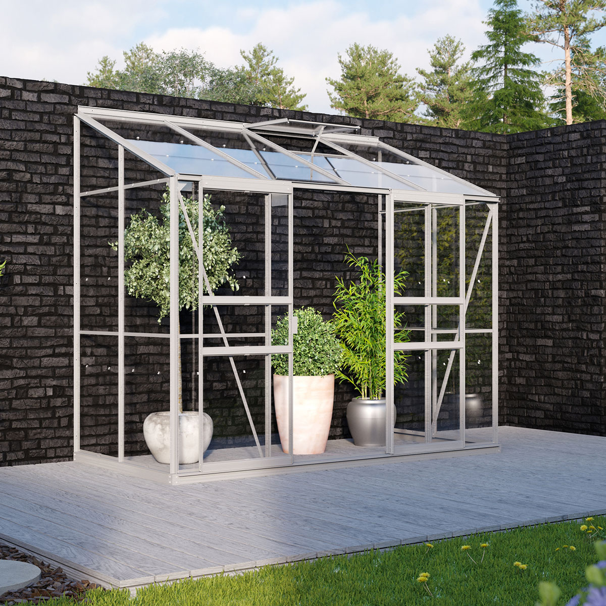 Ida växthus 3,3 kvm i anodiserad aluminium för placering mot vägg är idealiska för hobbyodlaren med begränsad plats. Modellen är designad för mindre trädgårdar, altaner och balkonger och lämpar sig utmärkt för odling av frön, kryddor och till exempel tomater. Ida har en skjutdörr upphängd på hjul för lätt öppning och stängning. Dörren kan spärras i delvis öppet läge för ventilation.