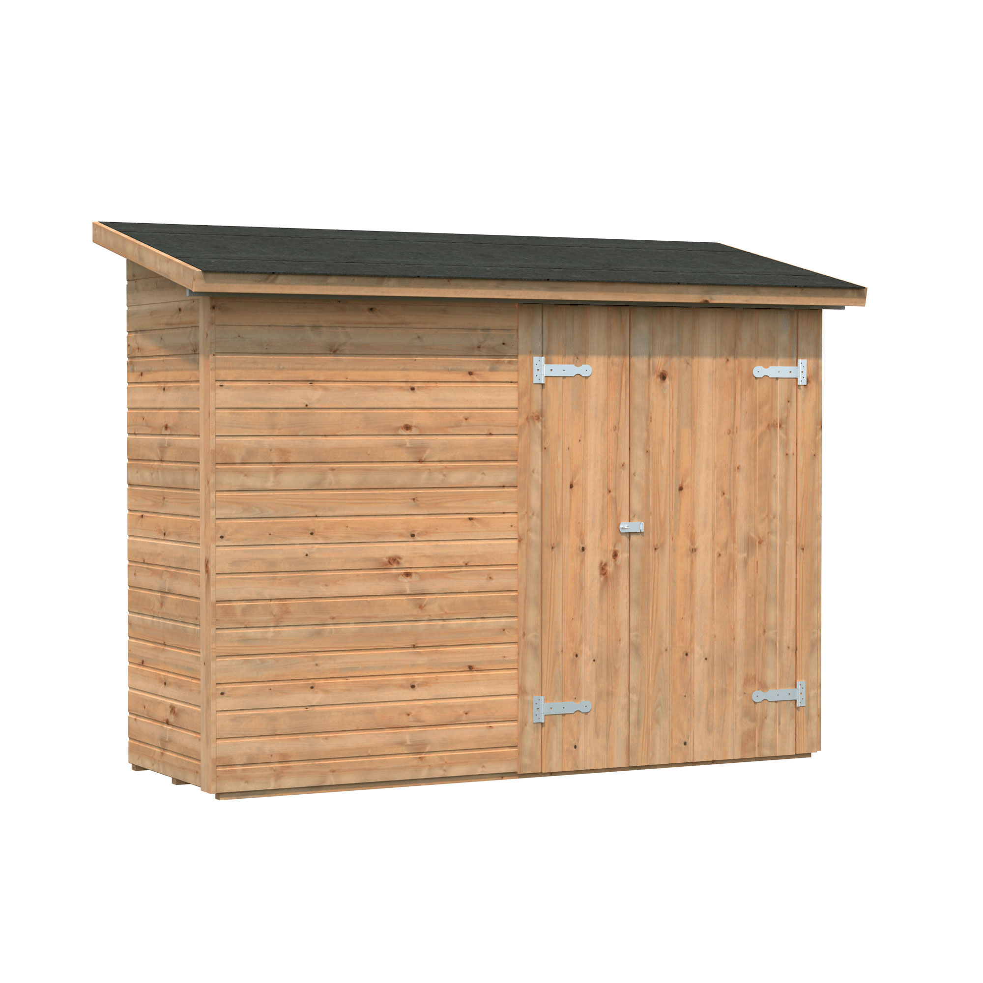 Färdiga väggelement i nordisk gran med en enkel pardörr. Obs! Förrådet är ämnat att byggas på befintlig vägg och har därför ingen egen bakvägg.