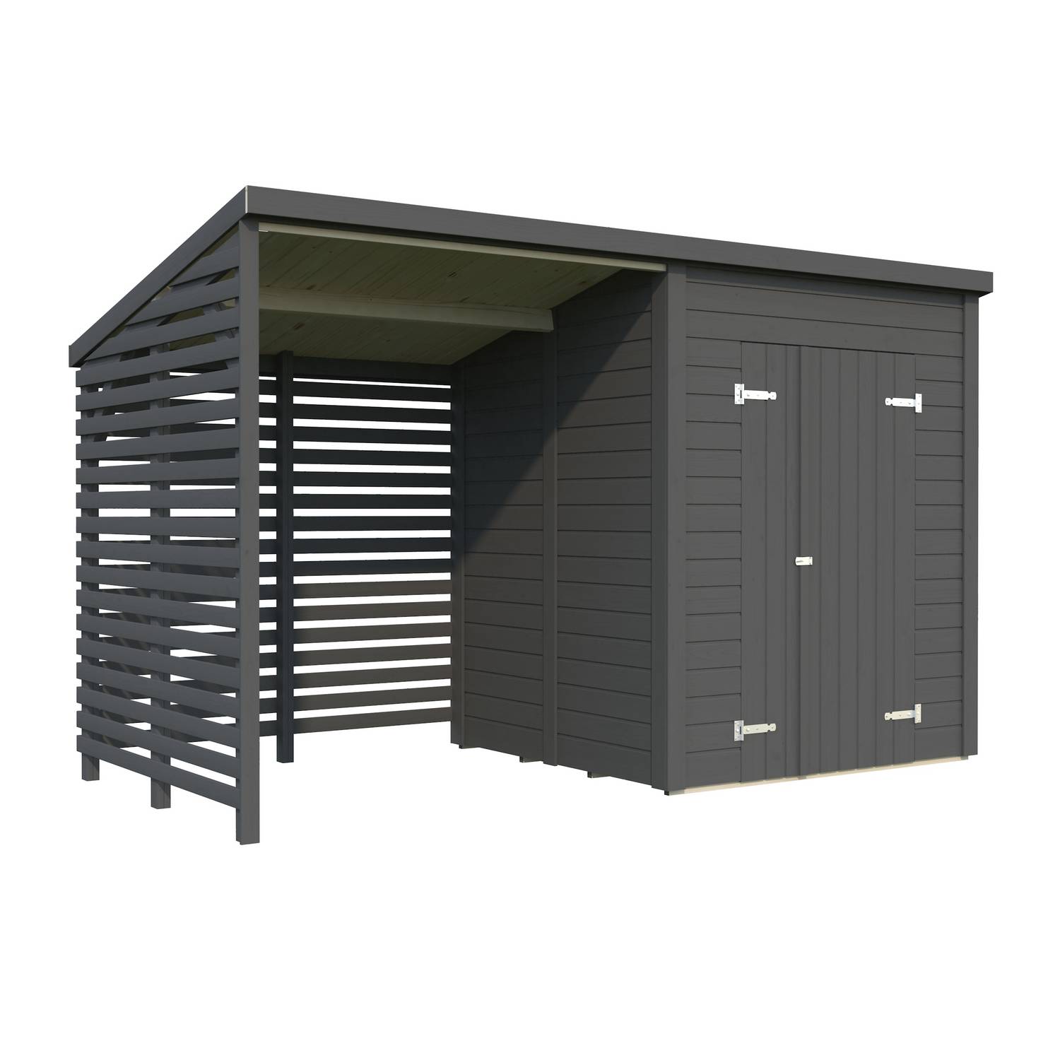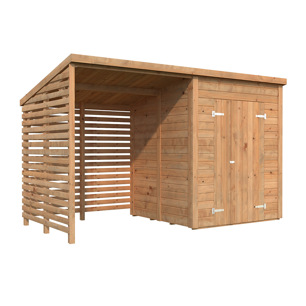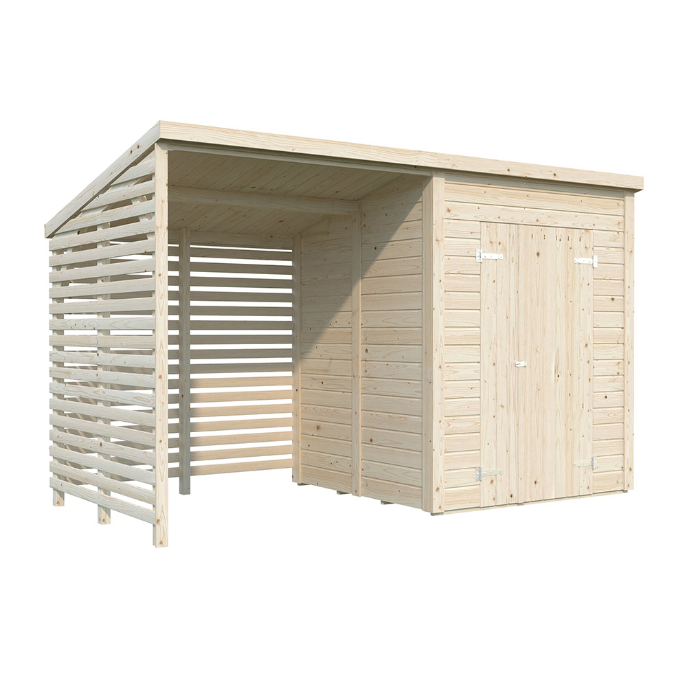 Leif är en praktisk förråd med utbyggnad för förvaring av trädgårdsredskap, gräsklippare, trädgårdsdynor etc. Förrådet är tillverkat av prefabricerade väggelement och är enkelt att montera. Dubbeldörrar på framsidan gör det enkelt att ta in större föremål som trädgårdsmaskiner och trädgårdsmöbler. Praktisk sidobyggnad för förvaring av t.ex. ved, cyklar etc. Levereras som byggsats inklusive golv och alla infästningar.