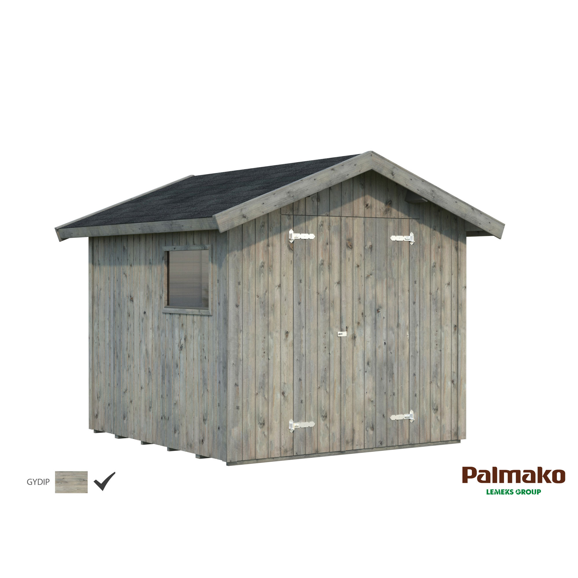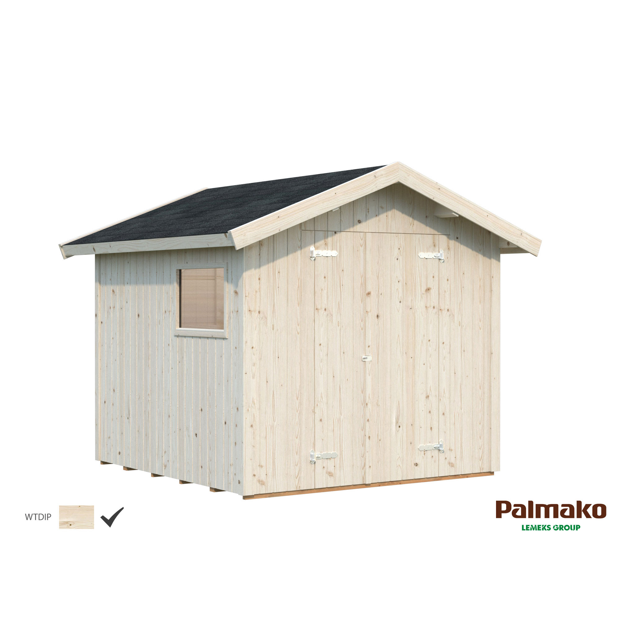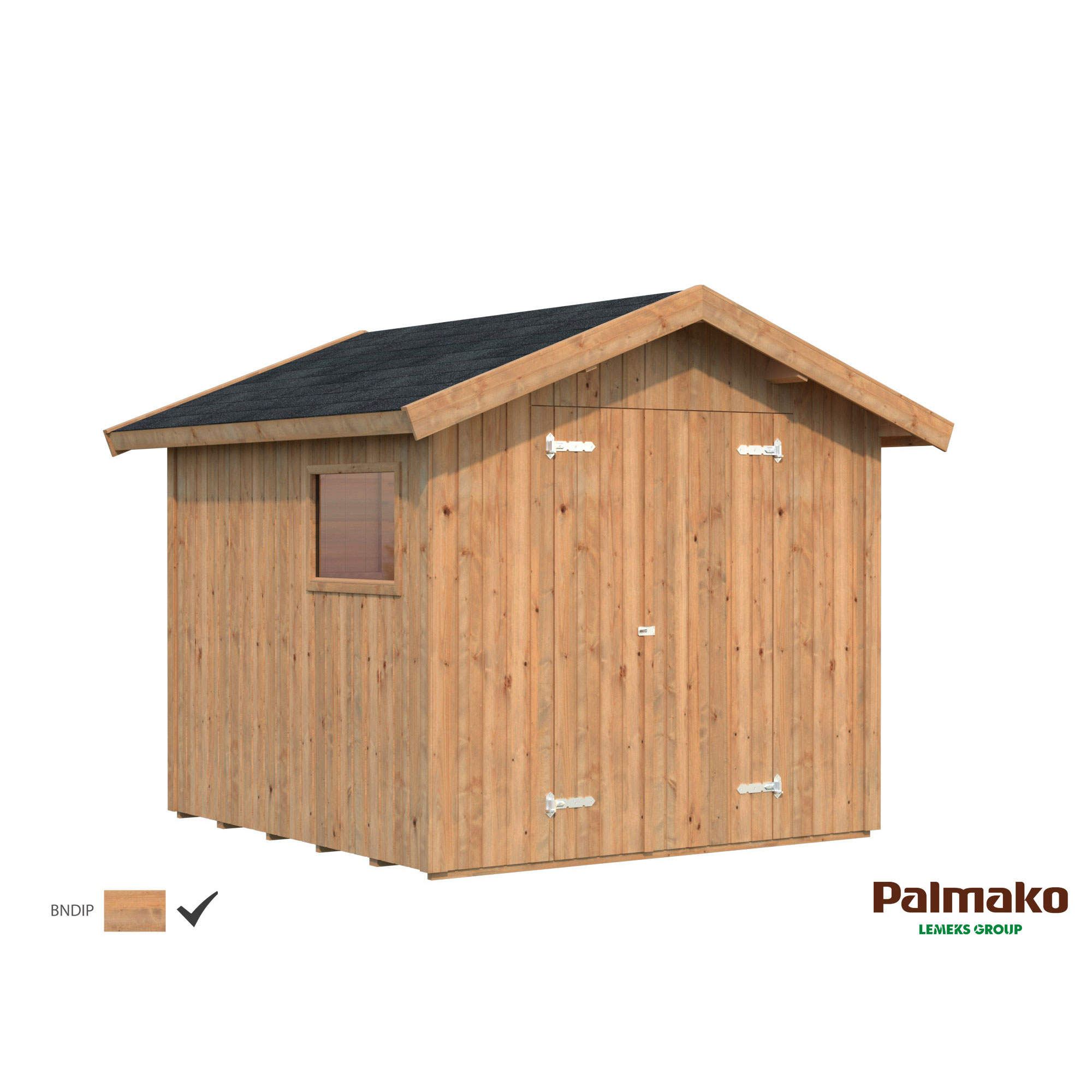 Nils är ett förråd med ett fast fönster i plexiglas och en pardörr. Modernt knutförband för en enkel montering.