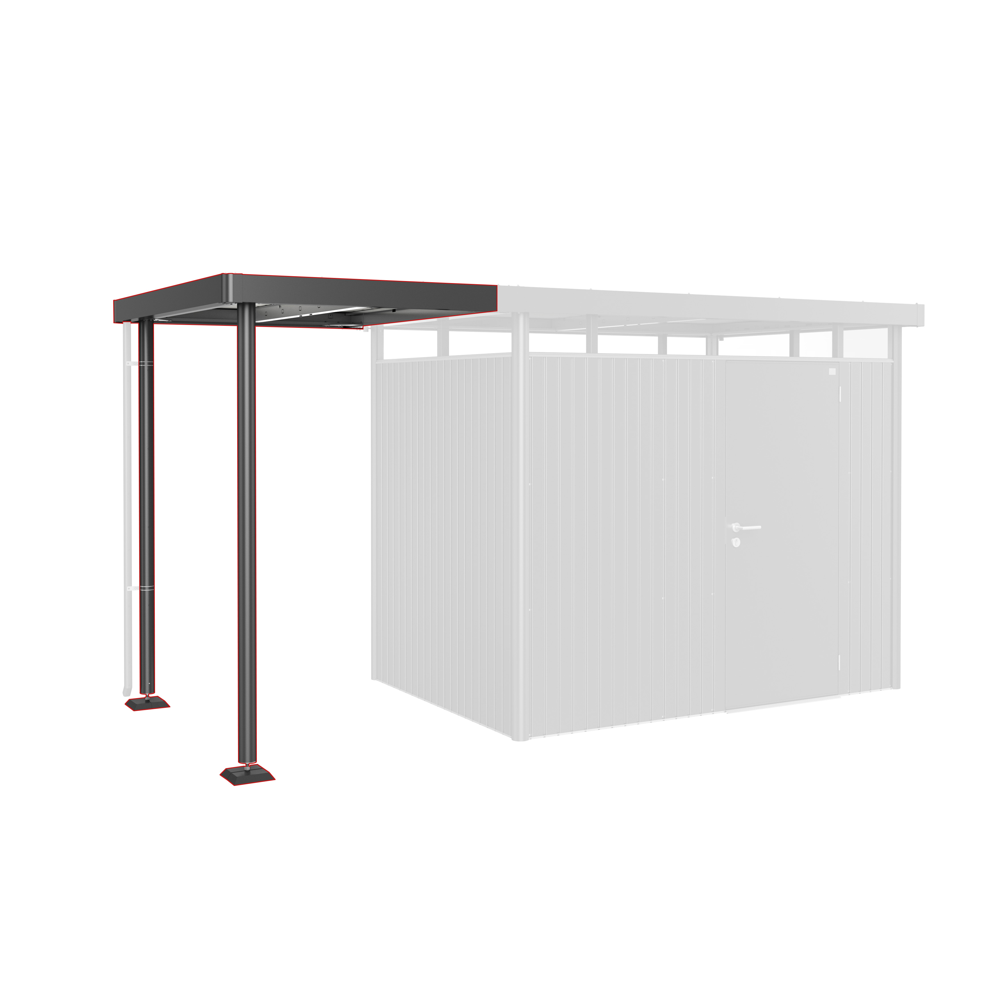Sidotaket kan fästas på boden HighLine® (från storlek H2 och uppåt) på sidan med hängrännan – antingen på ena eller båda sidorna. Den finns i två olika storlekar. Sidotaket S är 150 cm brett och storlek L är 282 cm. Stödbenen i aluminium är utrustade med fötter som kan justeras i höjdled. Stuprör ingår.