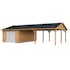 Palmakos garage Roger 19,0+33,2 m2  med solid 44 mm knuttimmervägg är inte bara den perfekta lösningen för att hålla din bil säkert inomhus, utan den har också funktionaliteten att behålla dina familjefordon under den skyddande carporten, samtidigt som det ger extra utrymme för dina förvaringsbehov. De generösa måtten gör att du kan parkera din bil bekvämt och har extra utrymme för verktyg, cyklar och andra föremål.