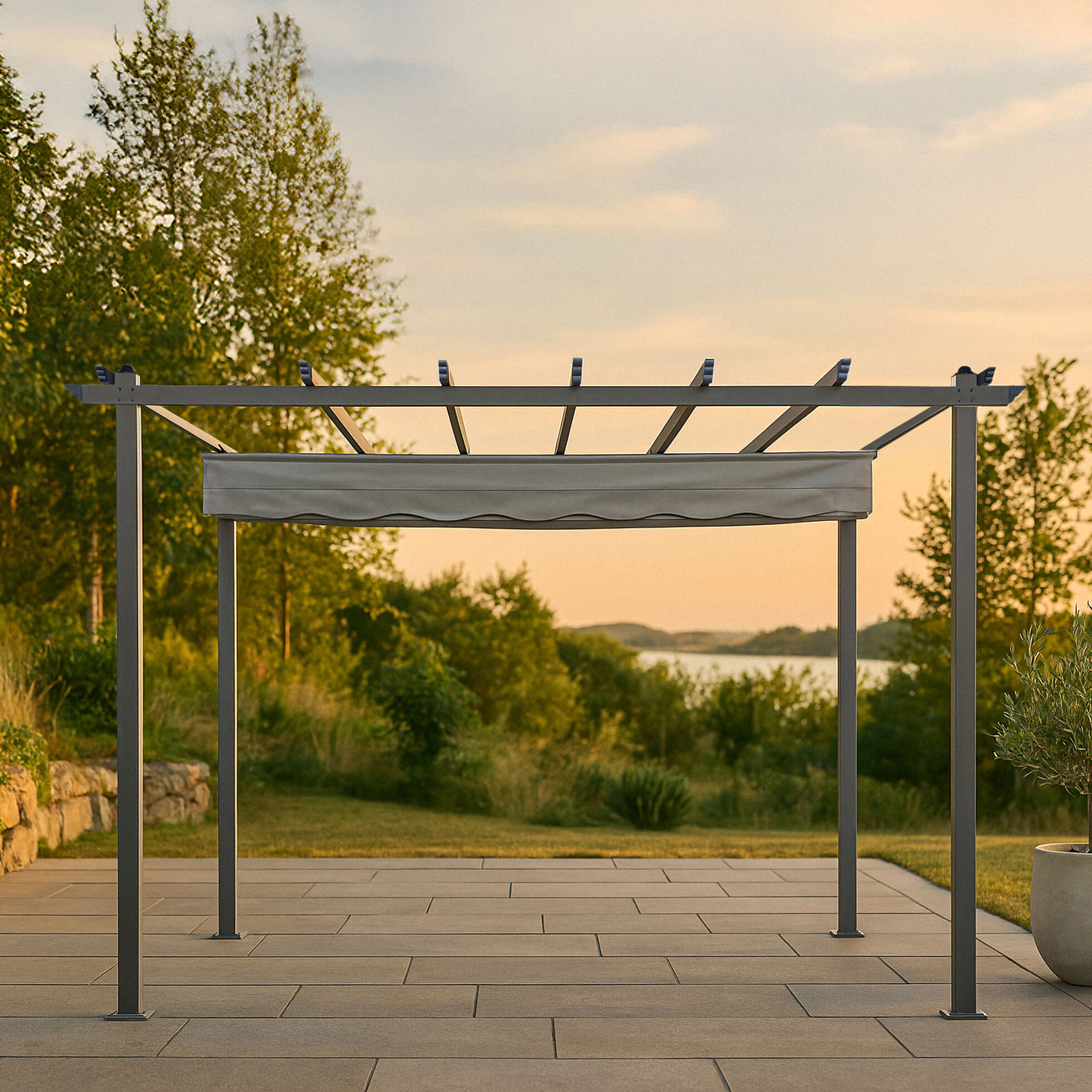 Pergola Lazio från Venture Home. Pergola utan sidoväggar fungerar som solskydd samtidigt som den är en fin inramning till din uteplats. Pergolan har en stomme i aluminium och ett tak i polyester.