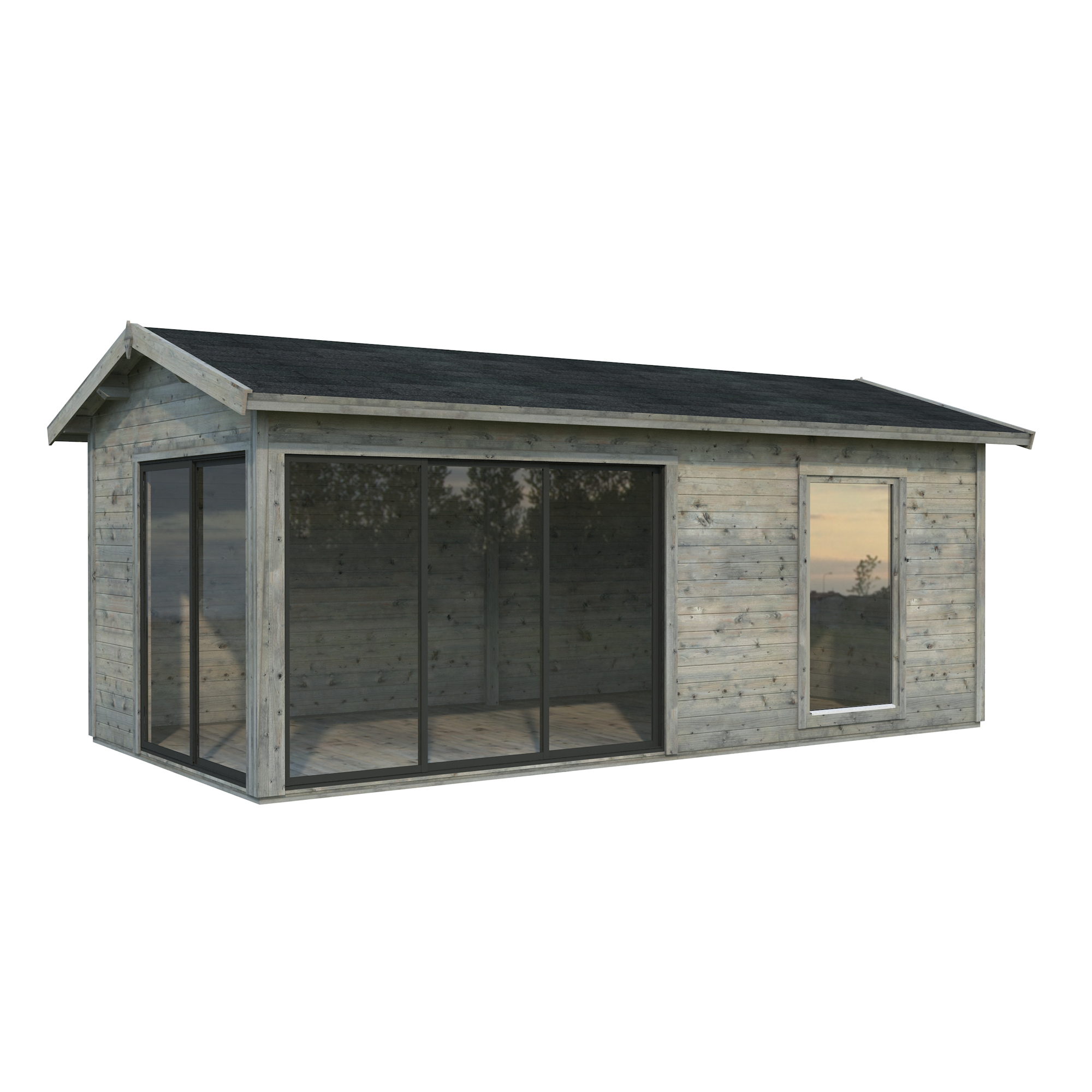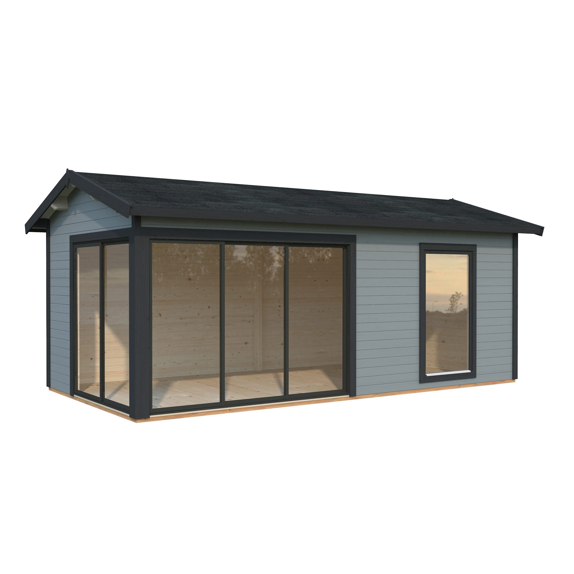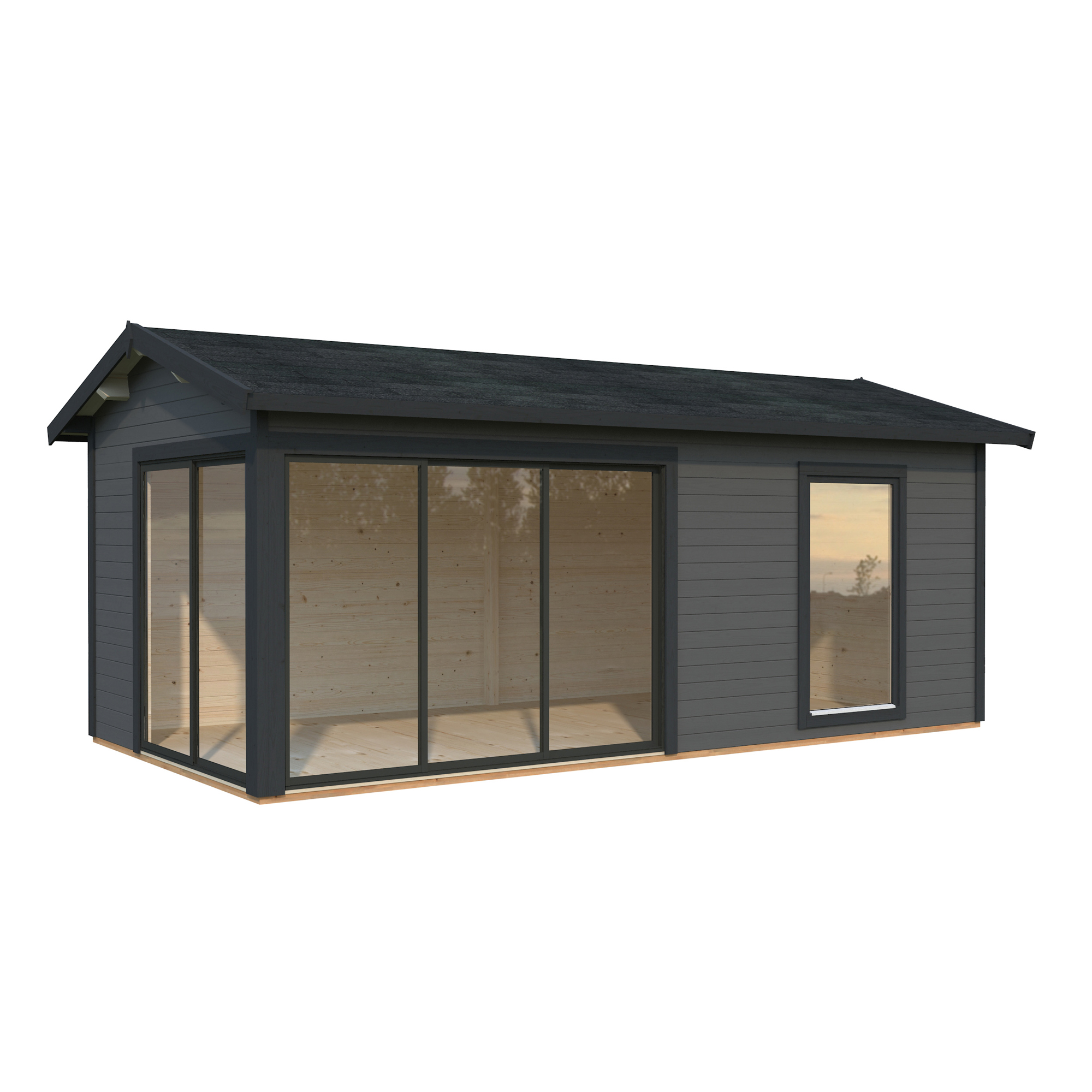 Palmakos stuga Amanda 17,1 m² Slide är ett mångsidigt och modernt trädgårdshus som passar perfekt för olika användningsområden. Med sina 44 mm tjocka väggar och sadeltak erbjuder den ett stilrent utseende. De två uppsättningarna av skjutdörrar i aluminium och härdat säkerhetsglas ger både en elegant design och ett bra ljusinsläpp, vilket gör den till ett ljust och luftigt utrymme.