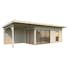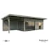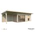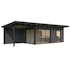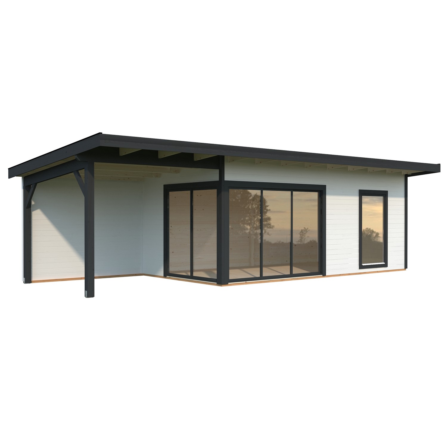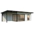 Stugan Andrea med förlängt flackt tak skapar ett modernt uttryck och blir ett stilfullt inslag i din trädgård. Skjutpartier finns även i två väggar så att dessa stora glasytorna släpper in generöst med ljus och tillåter fantastisk utsikt.