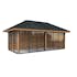 Tillverkad av nordisk gran med 120x120 mm starka limträstolpar och 19 mm takbrädor. Låsbara skjutdörrarna i 24 mm härdat dubbelglas (4 mm härdat glas - 16 mm luftspalt - 4 mm härdat glas) monterat i solida aluminiumprofiler. 28 mm väggstockar.