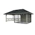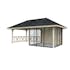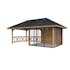 Tillverkad av nordisk gran med 120x120 mm starka limträstolpar och 19 mm takbrädor. Låsbara skjutdörrarna i 24 mm härdat dubbelglas (4 mm härdat glas - 16 mm luftspalt - 4 mm härdat glas) monterat i solida aluminiumprofiler. 28 mm väggstockar.
