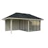 Tillverkad av nordisk gran med 120x120 mm starka limträstolpar och 19 mm takbrädor. Låsbara skjutdörrarna i 24 mm härdat dubbelglas (4 mm härdat glas - 16 mm luftspalt - 4 mm härdat glas) monterat i solida aluminiumprofiler. 28 mm väggstockar.
