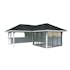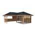 Tillverkad av nordisk gran med 120x120 mm starka limträstolpar och 19 mm takbrädor. Låsbara skjutdörrarna i 4 mm härdat glas och aluminium. 28 mm väggstockar.