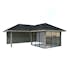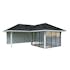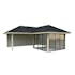 Tillverkad av nordisk gran med 120x120 mm starka limträstolpar och 19 mm takbrädor. Låsbara skjutdörrarna i 4 mm härdat glas och aluminium. 28 mm väggstockar.