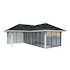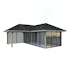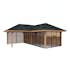 Tillverkad av nordisk gran med 120x120 mm starka limträstolpar och 19 mm takbrädor. Låsbara skjutdörrarna i 4 mm härdat glas och aluminium. 28 mm väggstockar.