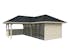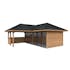 Tillverkad av nordisk gran med 120x120 mm starka limträstolpar och 19 mm takbrädor. Låsbara skjutdörrarna i 4 mm härdat glas och aluminium. 28 mm väggstockar.