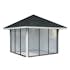 Tillverkad av nordisk gran med 120x120 mm starka limträstolpar och 19 mm takbrädor. Låsbara skjutdörrarna i 24 mm härdat dubbelglas (4 mm härdat glas - 16 mm luftspalt - 4 mm härdat glas) monterat i solida aluminiumprofiler. 28 mm väggstockar.