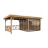 Tillverkad av nordisk gran med 120x120 mm starka limträstolpar och 19 mm takbrädor. Låsbara skjutdörrarna i 4 mm härdat glas och aluminium. 28 mm väggstockar.
