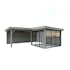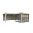 Tillverkad av nordisk gran med 120x120 mm starka limträstolpar och 19 mm takbrädor. Låsbara skjutdörrarna i 4 mm härdat glas och aluminium. 28 mm väggstockar. Rymligt skydd under tak.