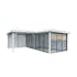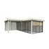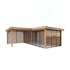 Tillverkad av nordisk gran med 120x120 mm starka limträstolpar och 19 mm takbrädor. Låsbara skjutdörrarna i 4 mm härdat glas och aluminium. 28 mm väggstockar. Jalusivägg.