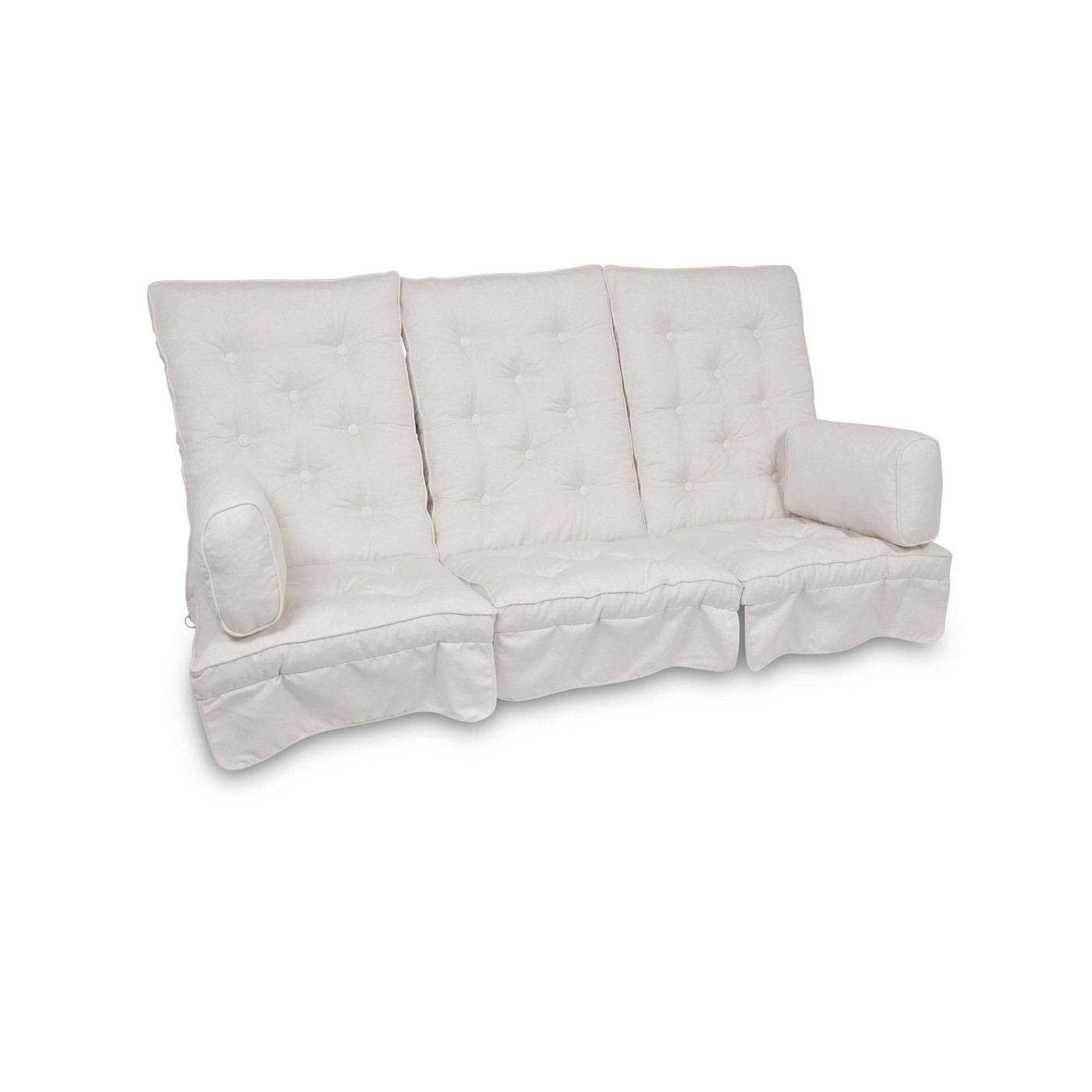 Dynorna är i kraftig Dralon/Akryl (90%) och Linne textil(10%) med en miljövänlig coating som gör att dynorna är vattenavvisande. Flockstoppade och boxsydda, inkl. sidokuddar, 8cm tjock