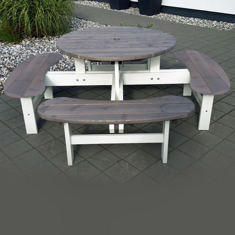 Ibland är det inte komforten som avgör utan platsen. Ett behändigt parkset med bänk och bord i ett, strategiskt placerat på din favoritplats, fulländar den enklaste picknicken. En trivsamt rund matplats för upp till 8 personer. Gruppen är tillverkad i svenskt FSC-furu. Levereras omonterad.