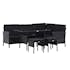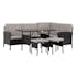 Soffgruppen består av en hörnsoffa i konstrotting med fyra sittplatser och en hörndel, två sittpallar samt ett högre bord i konstrotting med en bordsskiva i glas.