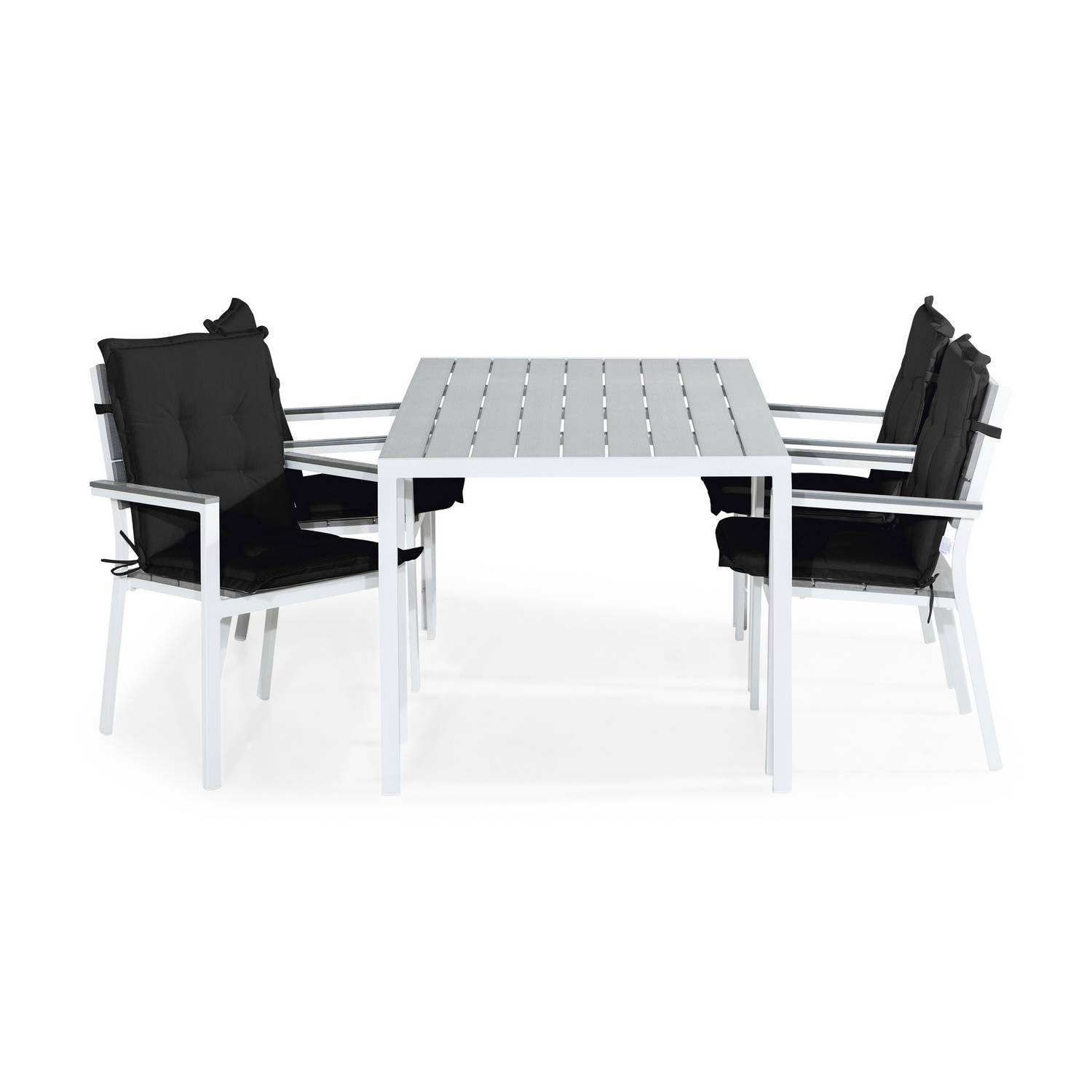 Matbordet passar, tack vare sin enkla och raka design, de flesta uteplatser. Slitstark och lättmatchad matgrupp. Stabilt bord finns i olika färger. Kombineras här tillsammans med 4 st Tunis stapelbara stolar. Lättskött och nästintill underhållsfri.