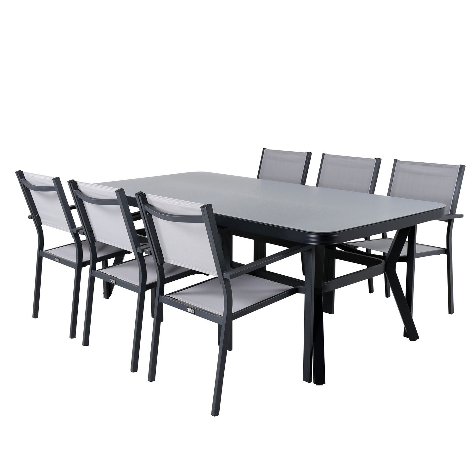 Matgrupp Vyn med ett matbord i svart aluminium och grått glas. Matchas tillsammans med 6 st Curz matstolar med en ram i svart aluminium. Bord och stol kräver enklare montering.
