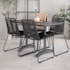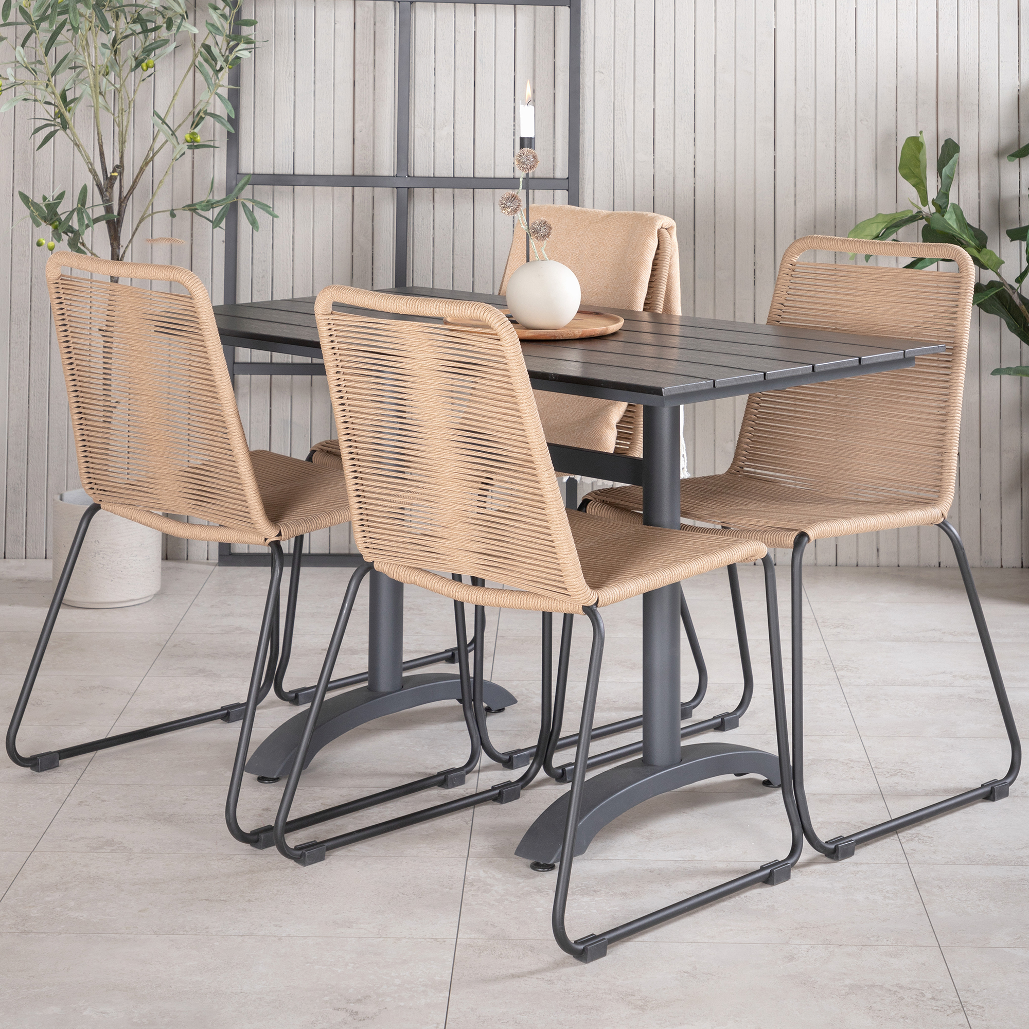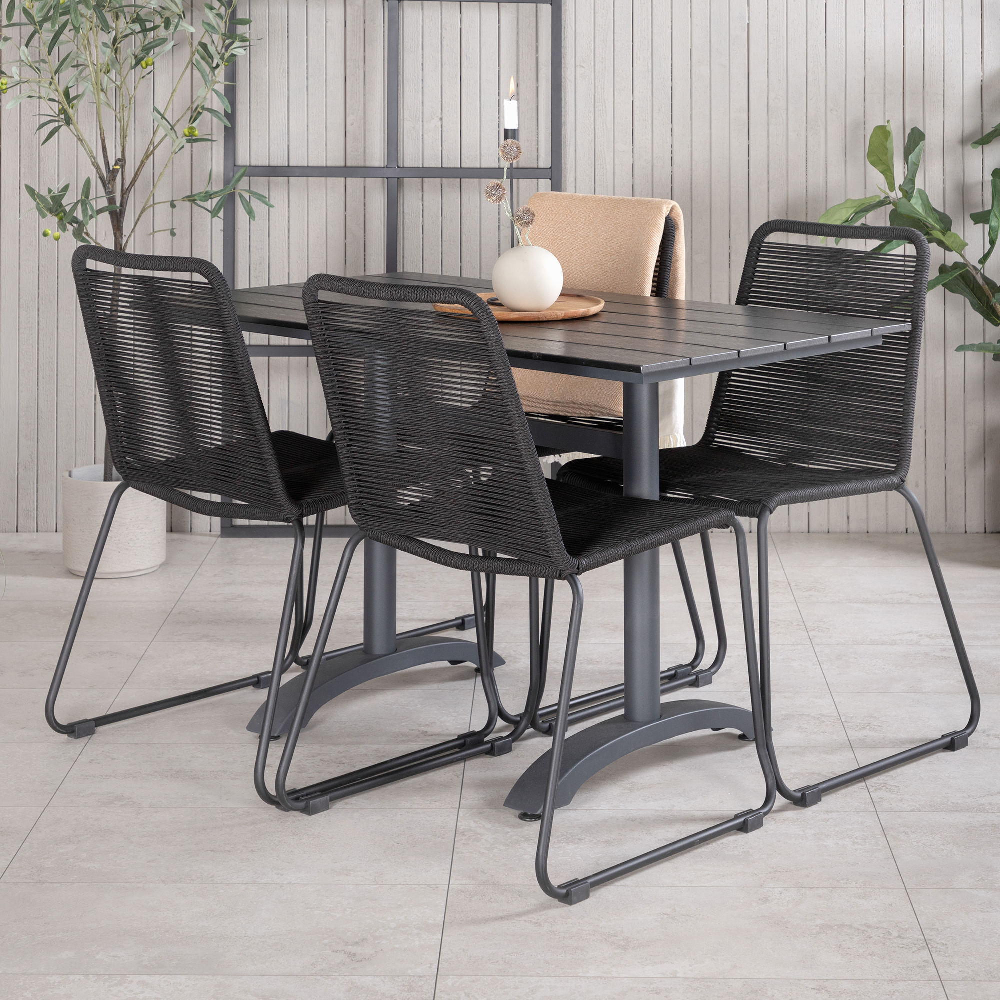 Matgrupp från Venture Home. Samla ihop dina vänner och njut tillsammans av en solig dag i trädgården runt denna matgrupp. Matbordet Denver har bordsben i aluminium och en bordsskiva i svart aintwood. Matchas med 4 st Lindos stapelbara matstolar i svart stål. Enklare montering krävs.