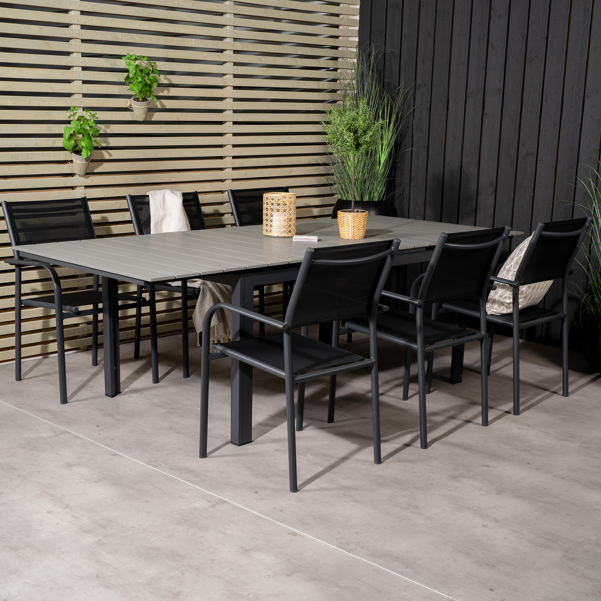 Matgrupp Venture Home Lova med sex stycken Siri stolar. Bordet har en iläggsskiva som gör att du kan förlänga bordet från 1600 till 2400 mm.