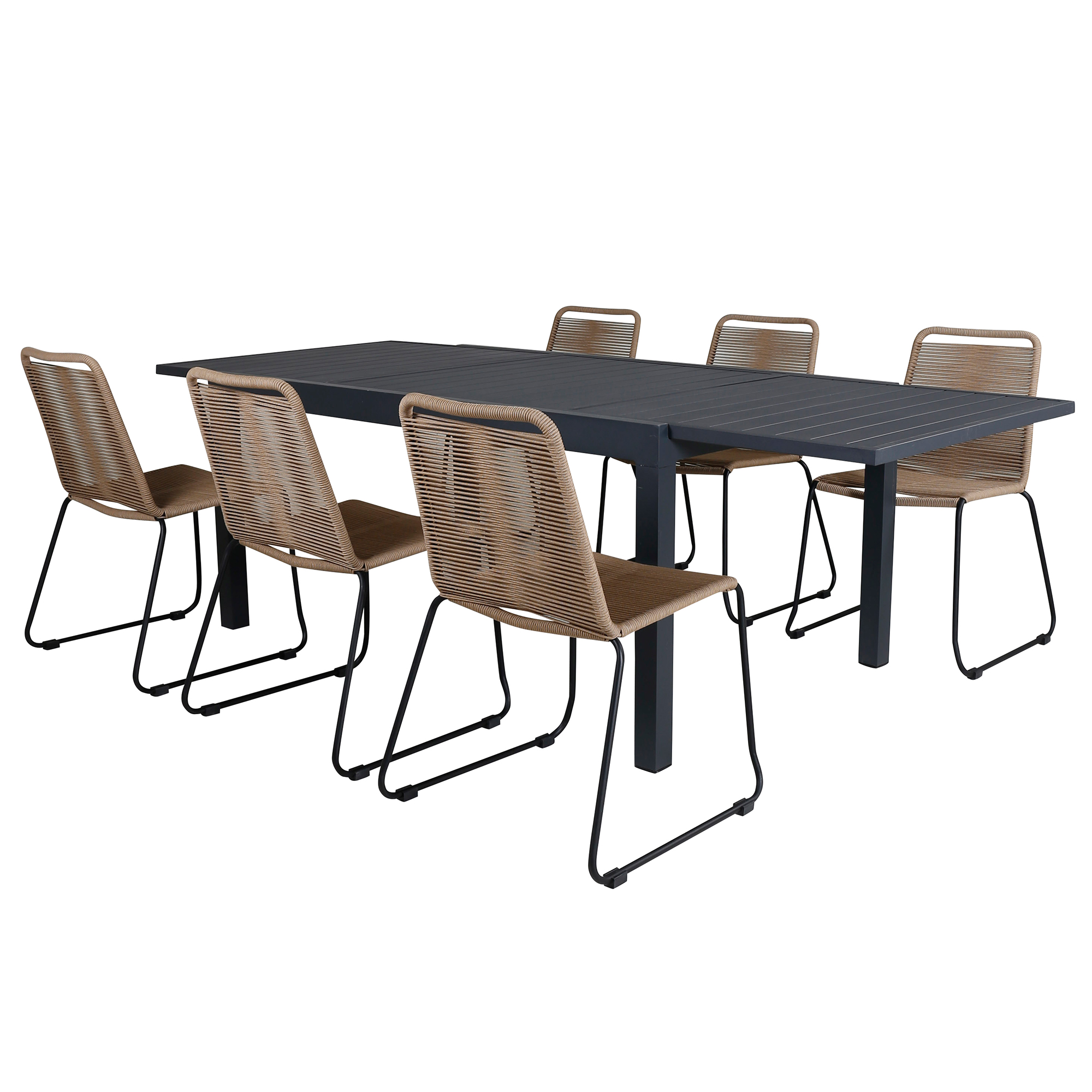 Skapa en härlig och inbjudande känsla i din trädgård med denna stilsäkra matgrupp. Matgrupp Marbella med bordskiva i aluminium. Matgruppen kommer tillsammans med 6st Lindos matstolar med en ram i svart stål och en sits i rep.