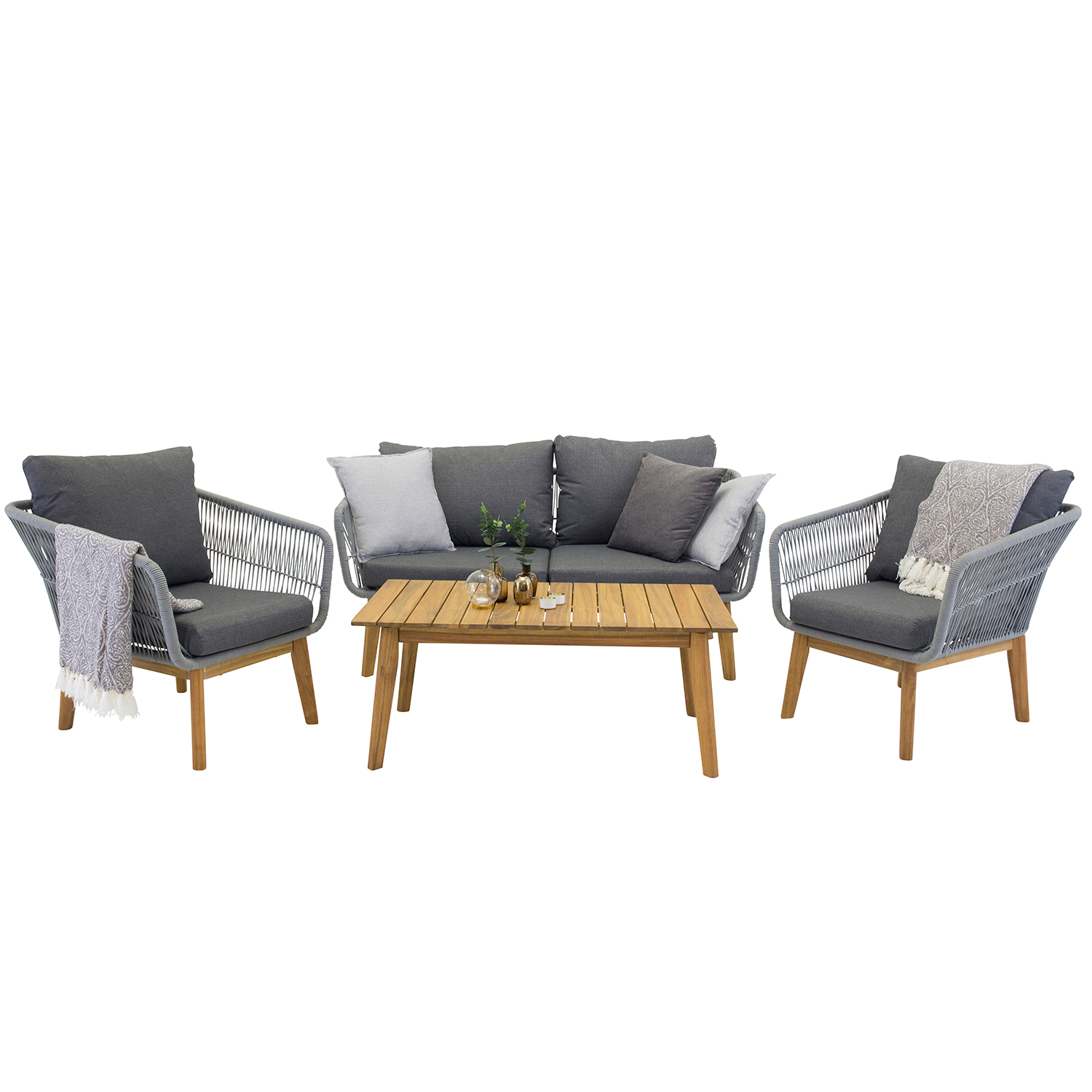Loungegrupp Chania från Venture Home består av 1 st 2-sits soffa, 2 st fåtöljer och 1 st bord. Dynor ingår.