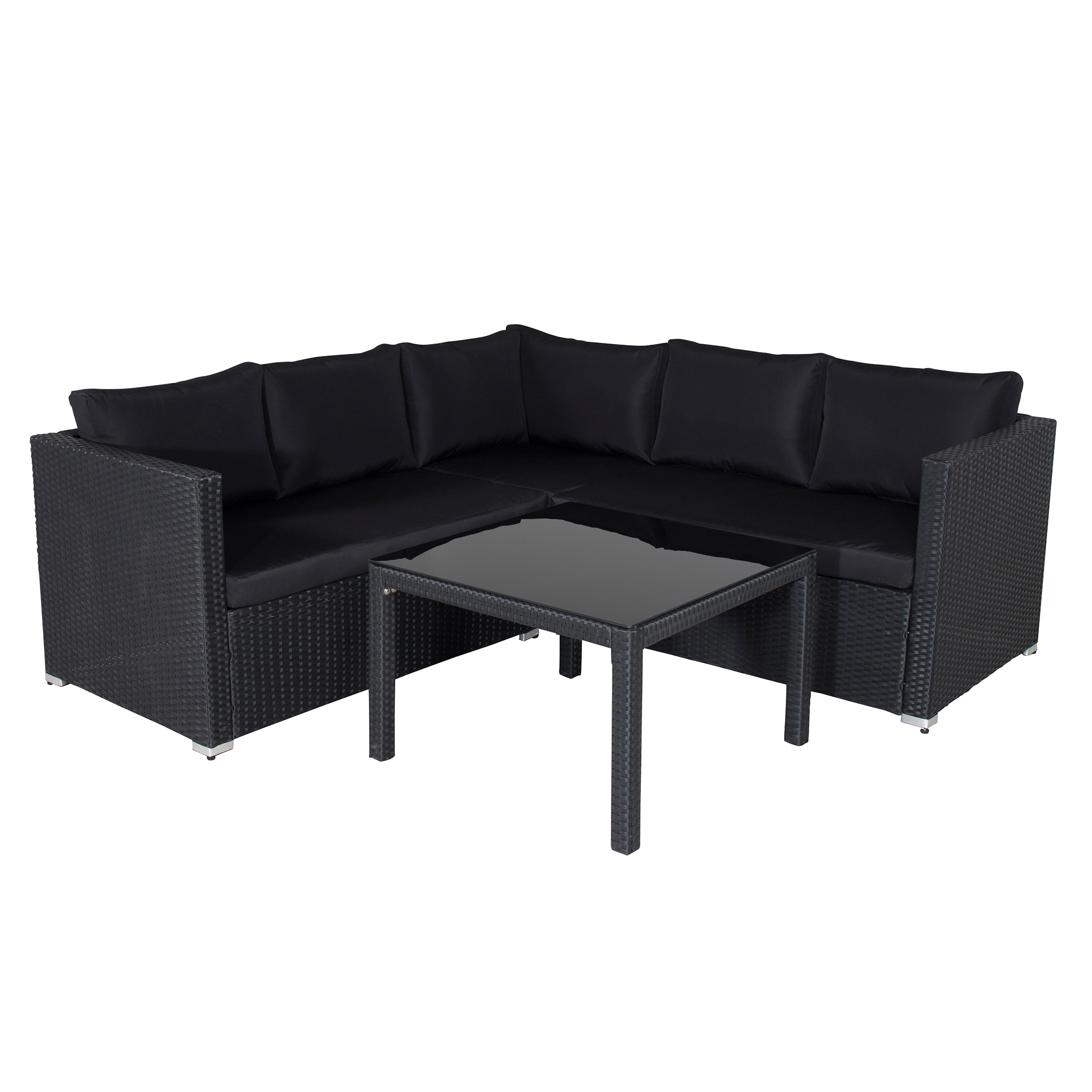 Soffgrupp Kimbali från Venture Home. Skön och snygg grupp i svart stål med tillhörande bord och en toppskiva i glas. Gruppen rymmer totalt 4 personer. Enklare montering krävs. Slitstarka dynor medföljer.