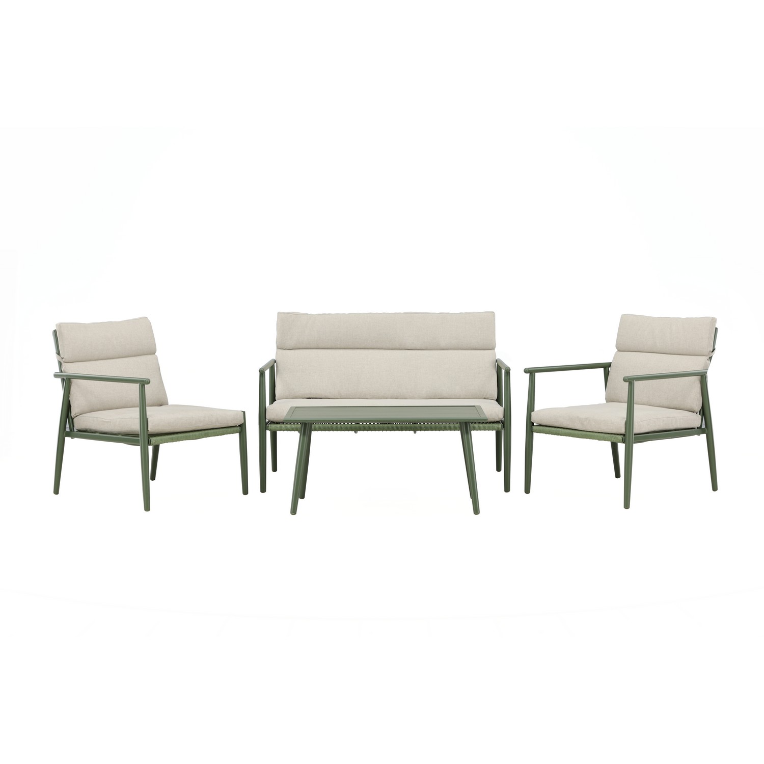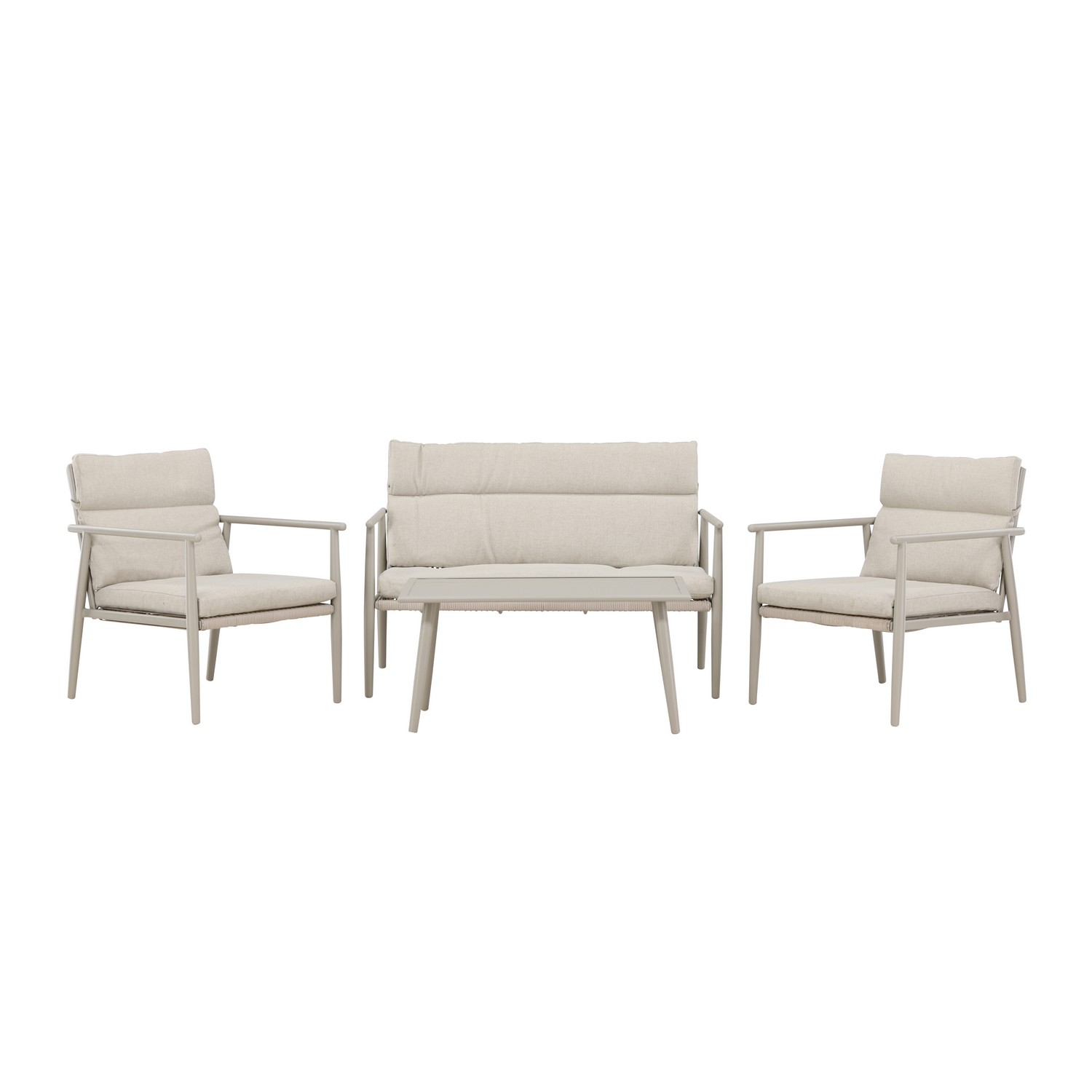 Mazzaro är den perfekta soffgruppen för dig som vill skapa en elegant och inbjudande atmosfär på uteplatsen. Denna stilrena grupp består av en rymlig soffa, två bekväma fåtöljer och ett smidigt rektangulärt bord – allt du behöver för att umgås och koppla av utomhus. Med en stabil ram i beige stål och mjuka, väldesignade dynor i matchande polyestertyg, bjuder Mazzaro på både kvalitet och komfort som håller över tid.