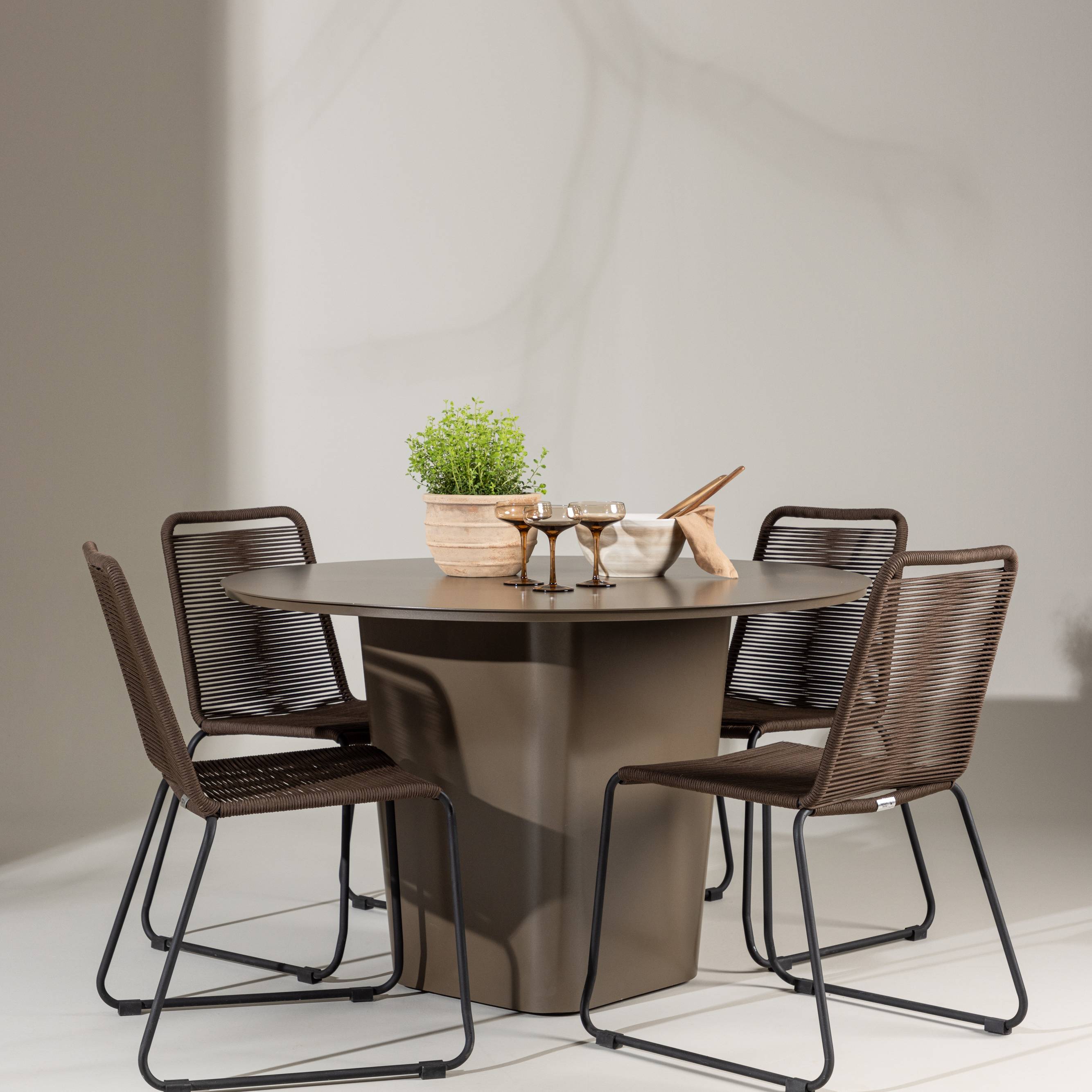 Bordet Santa är ett inbjudande centrum med en generös diameter på 120 centimeter, tillräckligt rymligt för att samla dina nära och kära. Tillverkat av aluminium i en elegant brun nyans, ger detta bord en touch av klass som står emot väder och vind.