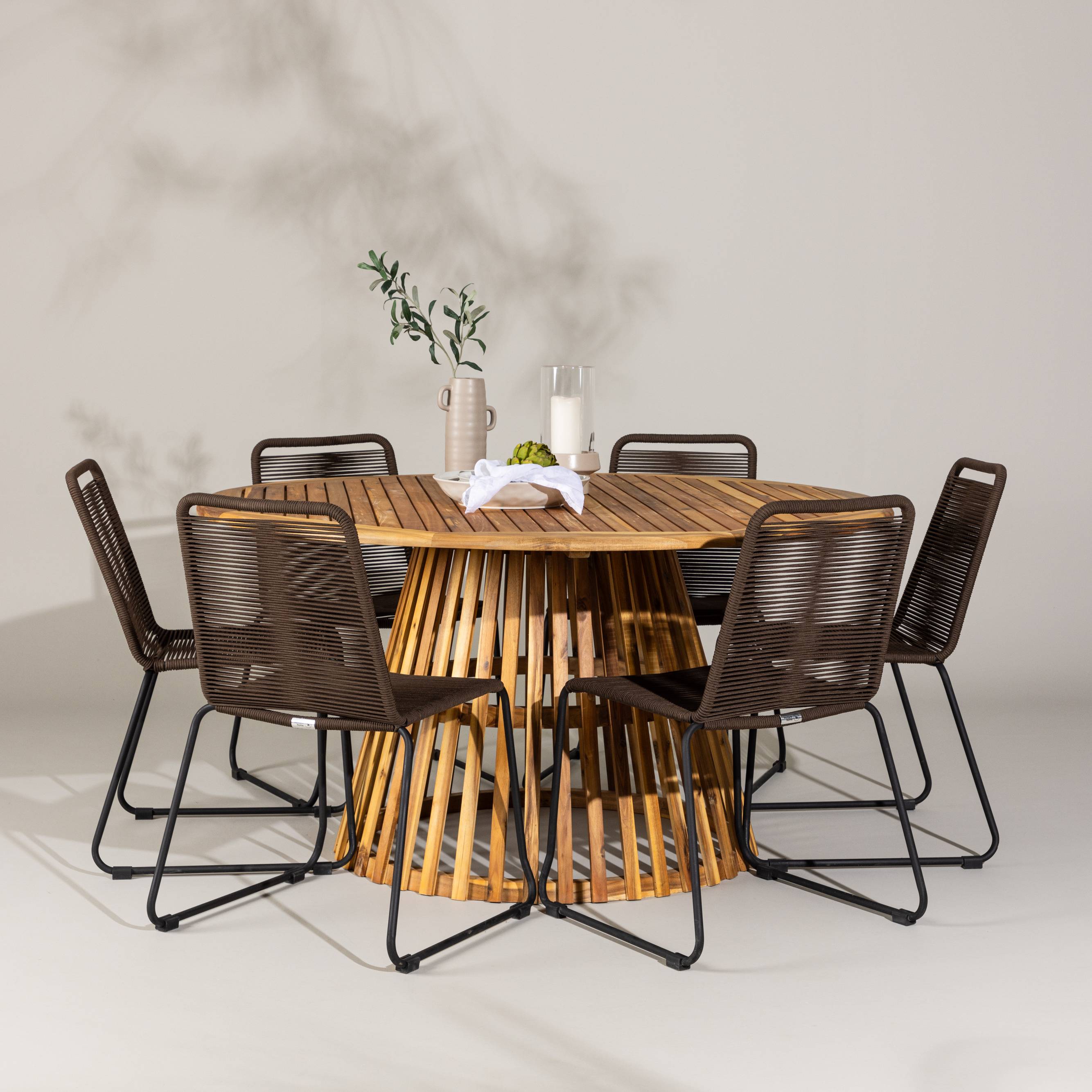 Upptäck den perfekta matgruppen för din utomhusmiljö med Venture Homes eleganta Tucumán-bord och de stilfulla Lindos-stolarna. Med en imponerande diameter på 120 cm erbjuder Tucumán-bordet gott om plats för familjemiddagar och trevliga tillställningar under öppen himmel.