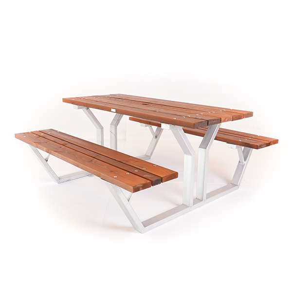 Tillverkat i stål, och bord och bänkar i svensk kärnfuru från Norrland, FSC ®-märkt.