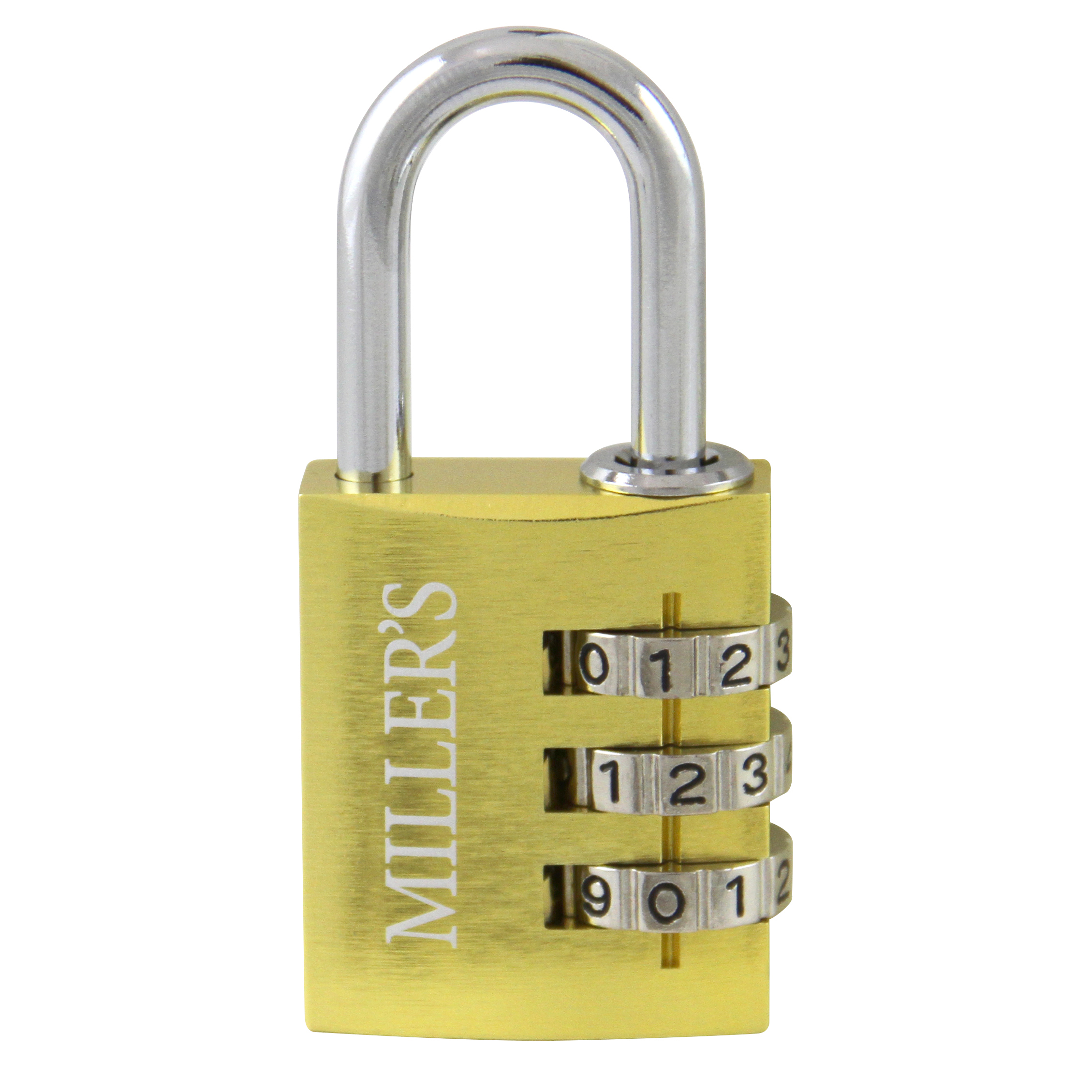 Kombinationshänglås från Miller`s med tre stycken sifferhjul. Förkromad stålbygel Ø 4,5 mm.